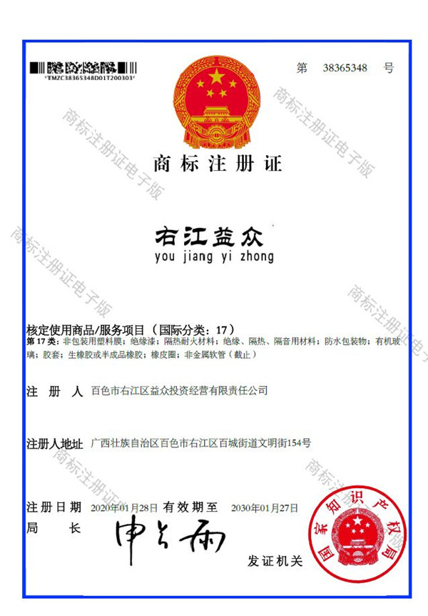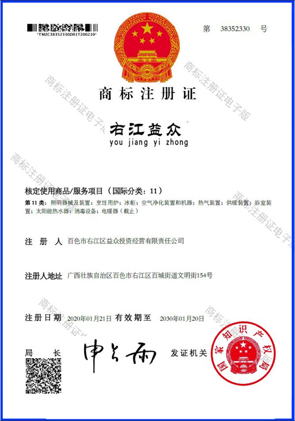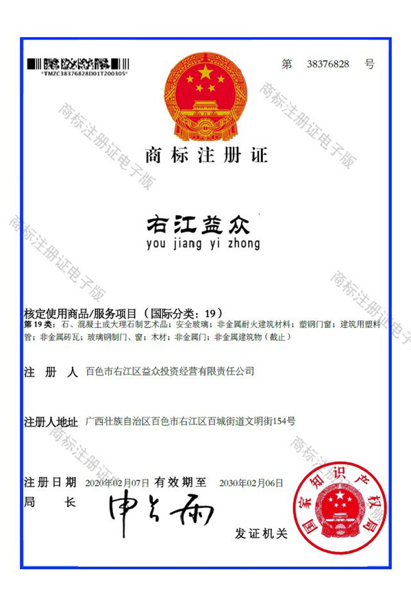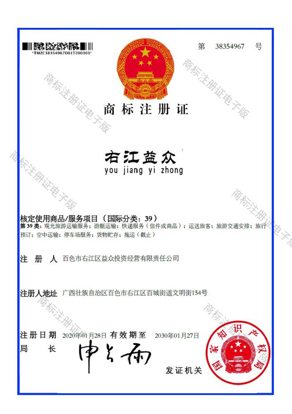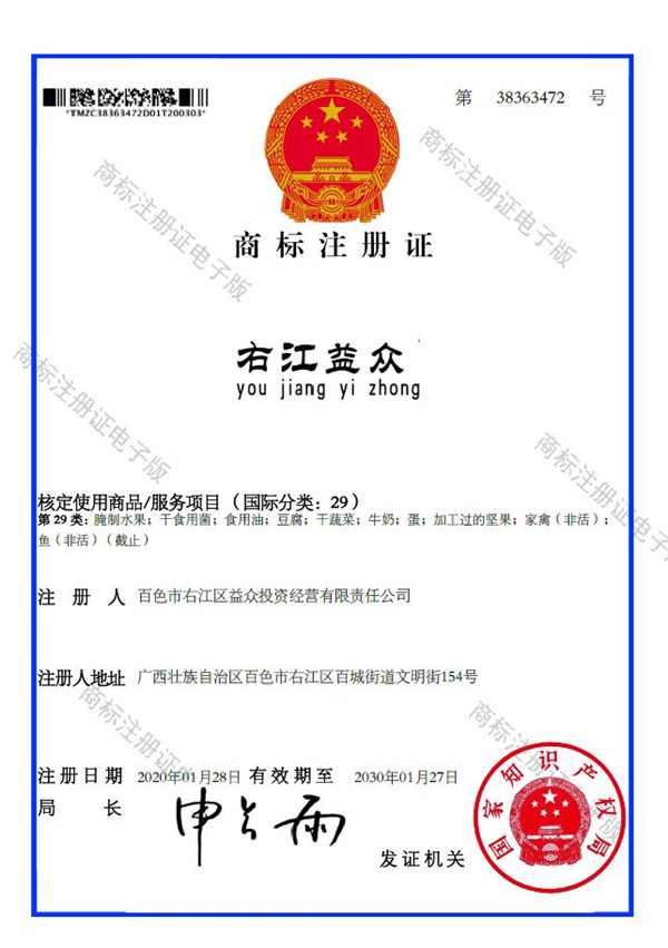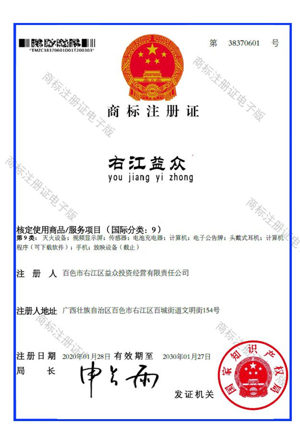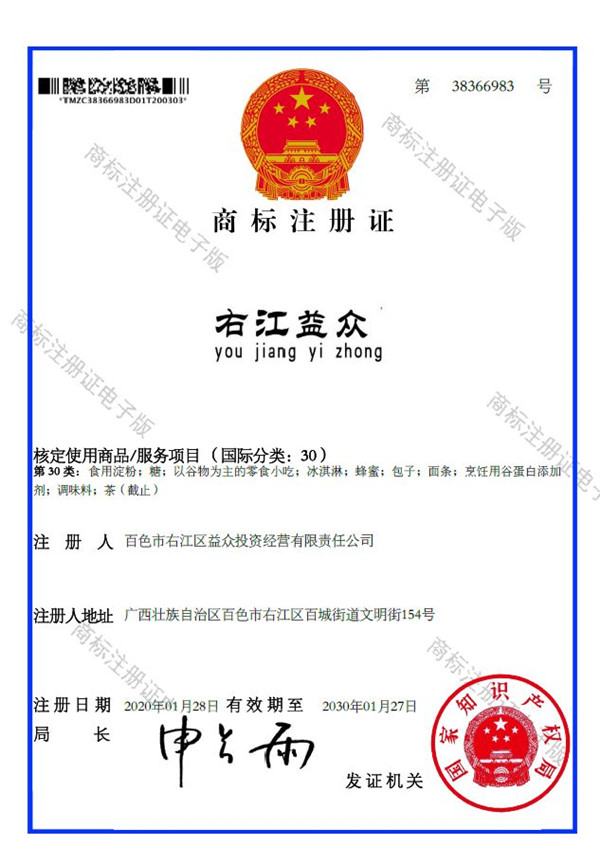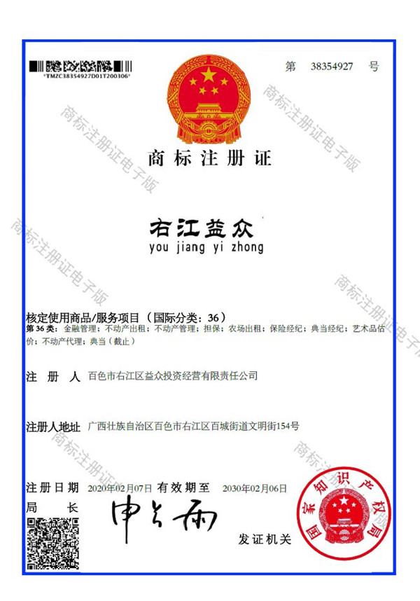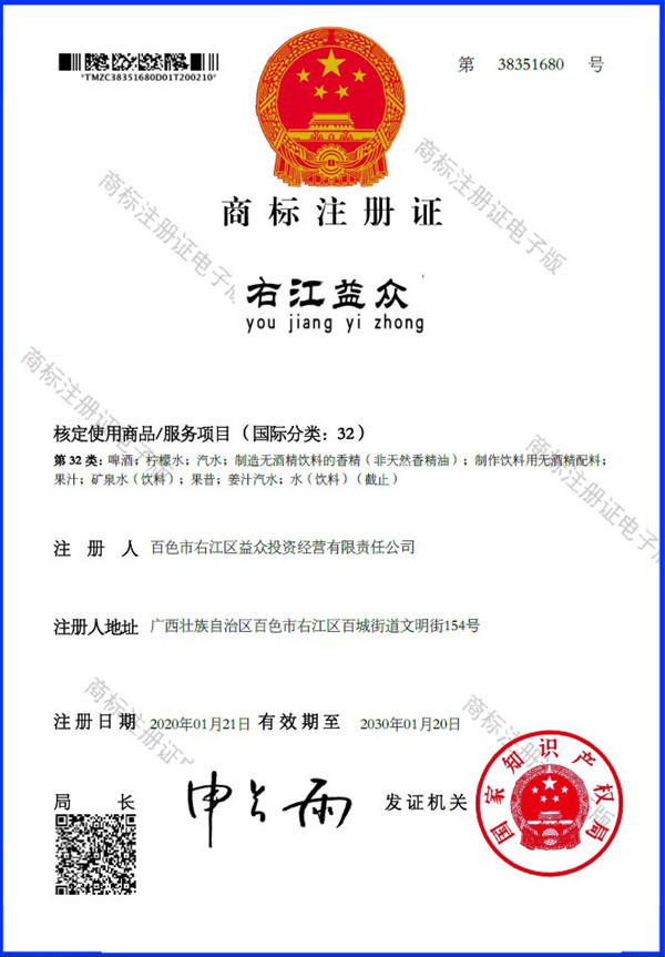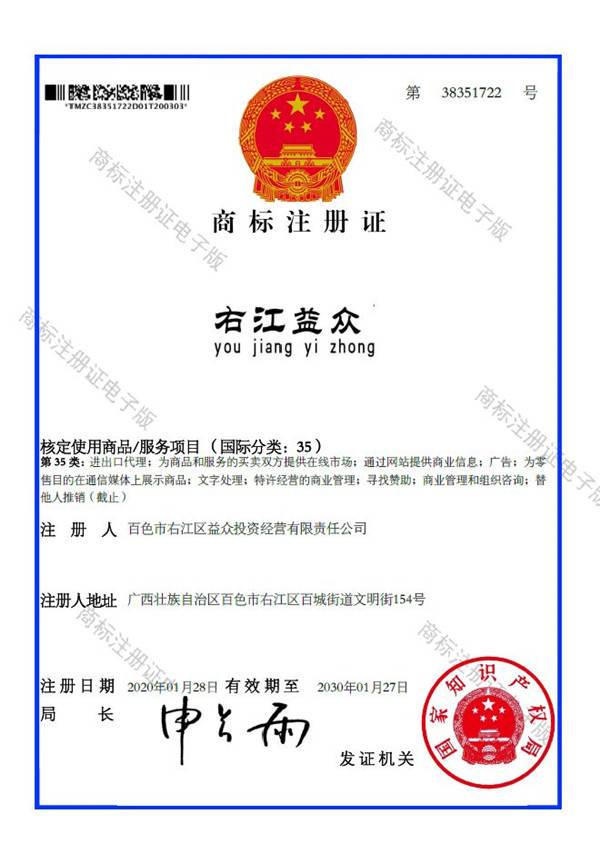 2019年4月,為樹立企業(yè)品牌形象,充分展現(xiàn)品牌價值,廣西百色益眾投資有限公司按照建設(shè)現(xiàn)代企業(yè)的方向和標(biāo)準(zhǔn),啟動品牌商標(biāo)注冊申報(bào)工作,經(jīng)過6個月的審核期和3個月的公告期,“右江益眾”45個大類商標(biāo)品牌第一時間成功獲批。“右江益眾”品牌的成功注冊,有利于公司更好地參與市場競爭,同時,對于強(qiáng)化企業(yè)內(nèi)部管理、樹立良好的企業(yè)形象、提升公司美譽(yù)度也可起到積極的助推作用。