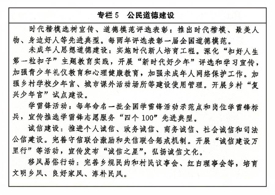 傳承弘揚(yáng)中華傳統(tǒng)美德,加強(qiáng)社會(huì)公德、職業(yè)道德、家庭美德、個(gè)人品德建設(shè),加強(qiáng)家庭、家教、家風(fēng)建設(shè)。加強(qiáng)對(duì)革命、建設(shè)、改革時(shí)期各類先進(jìn)典型的學(xué)習(xí)宣傳,尊崇褒揚(yáng)英雄模范,關(guān)心關(guān)愛先進(jìn)典型人物。健全家庭、學(xué)校、政府、社會(huì)相結(jié)合的思想道德教育體系,把立德樹人貫穿學(xué)校教育全過程。發(fā)揮優(yōu)秀文化產(chǎn)品陶冶道德情操的作用,完善市民公約、鄉(xiāng)規(guī)民約、學(xué)生守則、團(tuán)體章程等社會(huì)規(guī)范,廣泛開展弘揚(yáng)時(shí)代新風(fēng)行動(dòng),深化道德領(lǐng)域突出問題治理。加強(qiáng)農(nóng)村思想道德建設(shè),創(chuàng)新文化科技衛(wèi)生“三下鄉(xiāng)”長(zhǎng)效機(jī)制。