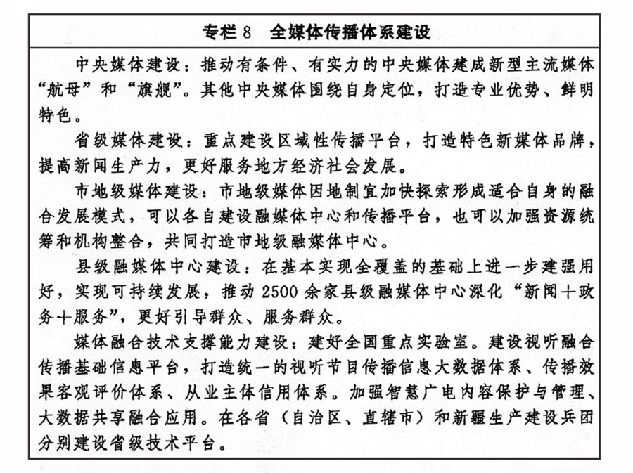 加快推進(jìn)媒體深度融合發(fā)展,有效整合各種媒介資源、生產(chǎn)要素,推動(dòng)在信息內(nèi)容、技術(shù)應(yīng)用、平臺(tái)終端、管理手段等方面共融互通,打造一批具有強(qiáng)大影響力、競(jìng)爭(zhēng)力的新型主流媒體。統(tǒng)籌處理好傳統(tǒng)媒體和新興媒體、中央媒體和地方媒體、主流媒體和商業(yè)平臺(tái)、大眾化媒體和專業(yè)性媒體的關(guān)系,建立以內(nèi)容建設(shè)為根本、先進(jìn)技術(shù)為支撐、創(chuàng)新管理為保障的全媒體傳播體系。推進(jìn)內(nèi)容生產(chǎn)供給側(cè)結(jié)構(gòu)性改革,完善高質(zhì)量?jī)?nèi)容產(chǎn)出機(jī)制,推廣互動(dòng)式、服務(wù)式、場(chǎng)景式傳播。強(qiáng)化新一代信息技術(shù)支撐引領(lǐng)作用,支持主流媒體重塑采編流程、建設(shè)平臺(tái)終端、優(yōu)化管理手段、強(qiáng)化版權(quán)保護(hù)、打造媒體資源數(shù)據(jù)庫、提升內(nèi)容生產(chǎn)力、占據(jù)傳播制高點(diǎn)。創(chuàng)新媒體業(yè)態(tài)、傳播方式和運(yùn)營(yíng)模式,強(qiáng)化用戶連接,發(fā)揮制度優(yōu)勢(shì)和市場(chǎng)作用,增強(qiáng)主流媒體競(jìng)爭(zhēng)力。
