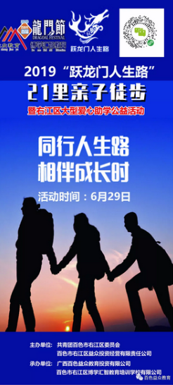 2019年百色市首屆龍門節(jié)暨右江區(qū)大型愛心助學公益活動第三場—“躍龍門人生路”親子徒步活動將于6月29日舉行,徒步全程10.5公里?;顒幽康氖菫榱烁玫貍鞑ァ凹彝?傳承+親子”的價值理念,以徒步的形式延伸出孩子成長路上的每個階段,徒步的背后蘊含著一個永不言棄的家庭奮斗精神。活動報名費用50元/家庭(含2家長+1孩子或者1家長+2孩子),所有報名費用由共青團百色市右江區(qū)委員會捐贈給右江區(qū)建檔立卡的貧困家庭學生。報名參與長按海報上二維碼識別繳費即可,歡迎廣大學生家長踴躍參與。