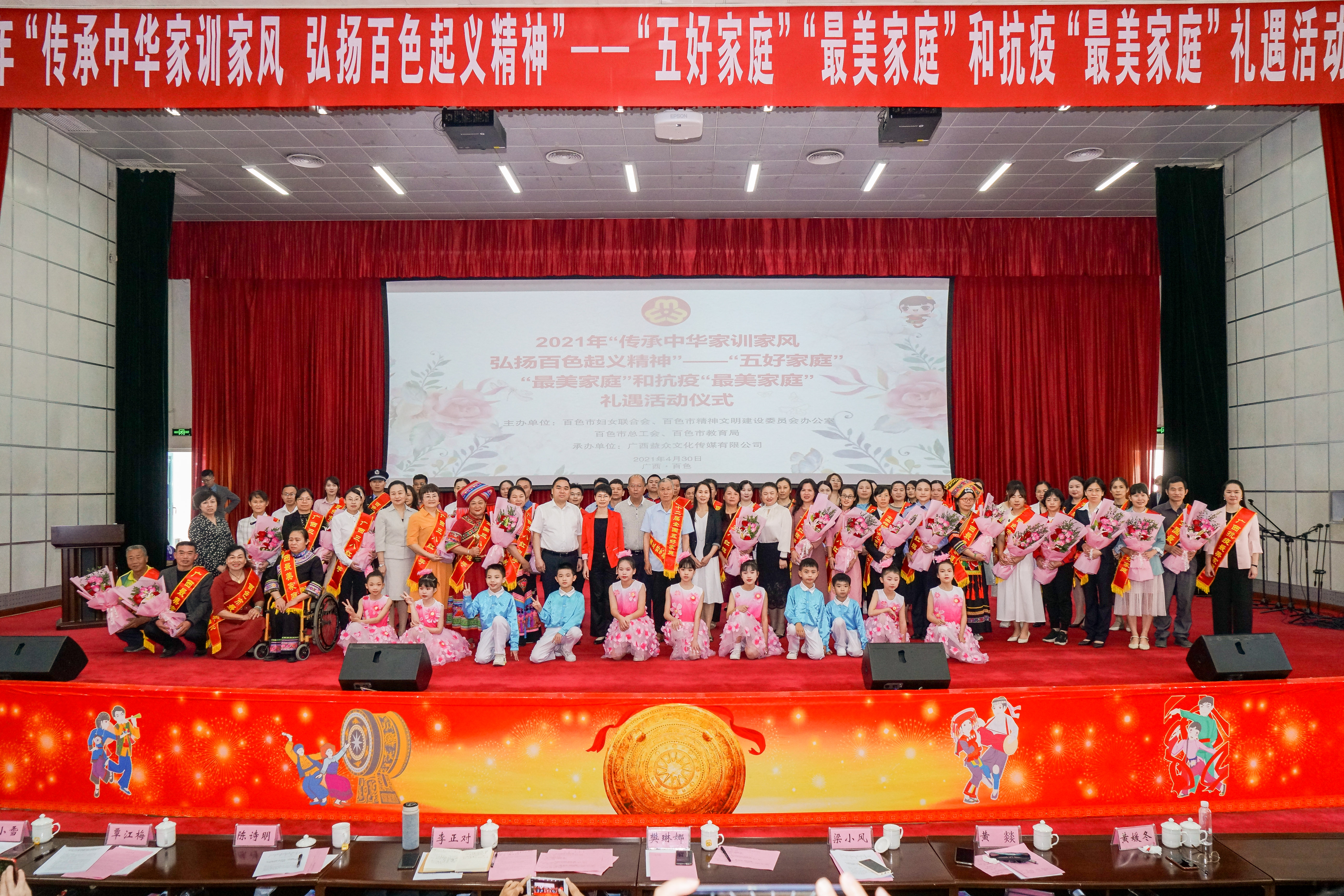 ????????為弘揚(yáng)中華民族家庭美德、樹(shù)立良好家風(fēng)、激勵(lì)抗疫精神,落實(shí)全國(guó)婦聯(lián)、自治區(qū)婦聯(lián)關(guān)于開(kāi)展尋找“最美家庭”活動(dòng)精神。4月30日,由百色市婦聯(lián)、市文明辦、市總工會(huì)、市教育局聯(lián)合舉辦,廣西益眾文化傳媒有限公司承辦的2021年“傳承中華家訓(xùn)家風(fēng)?弘揚(yáng)百色起義精神”——“五好家庭”“最美家庭”和抗疫“最美家庭”禮遇活動(dòng)儀式在右江區(qū)禮堂舉行。來(lái)自2020年“五好家庭”“最美家庭”和抗疫“最美家庭”代表、“最美家庭”禮遇愛(ài)心單位代表以及百色市市直機(jī)關(guān)、企事業(yè)單位和社會(huì)各界代表等共計(jì)200多人參加活動(dòng)。