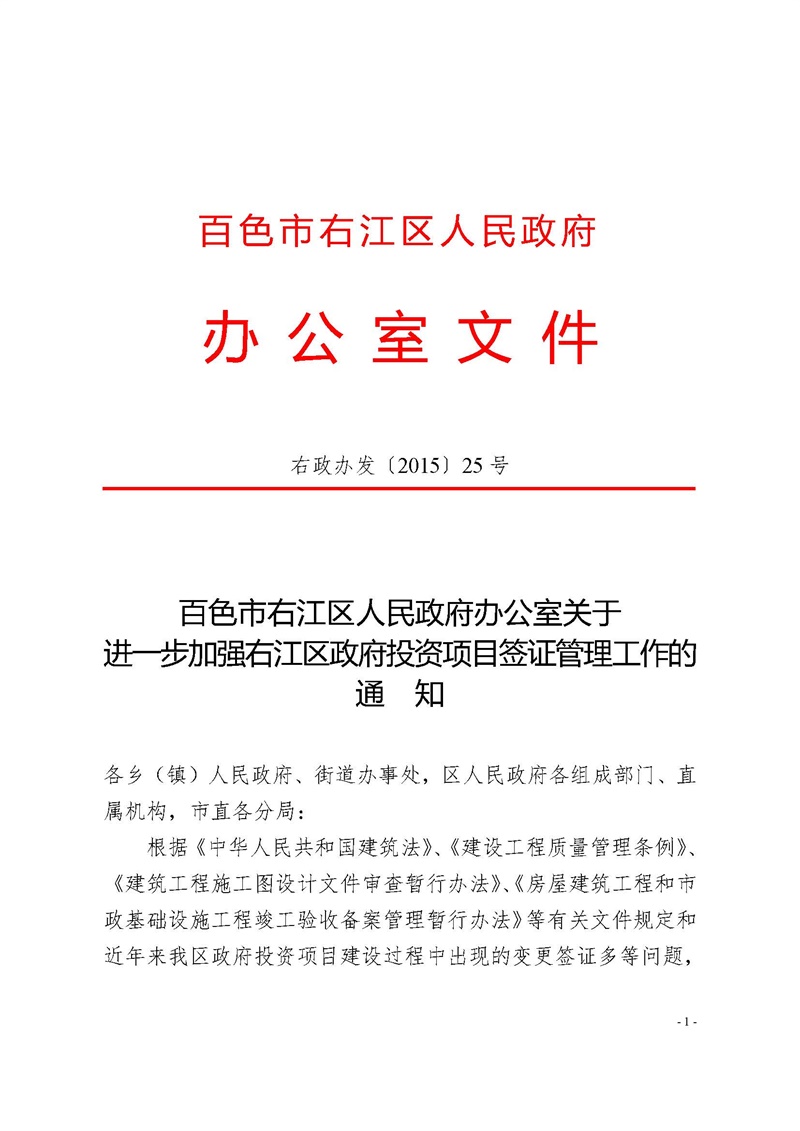 右政辦發(fā)[2015]25號 關于進一步加強右江區(qū)政府投資項目簽證管理工作的通知