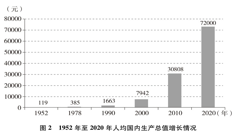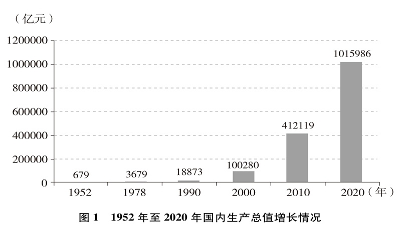 經(jīng)濟實力大幅提升。中國國內(nèi)生產(chǎn)總值從1952年的679.1億元躍升至2020年的101.6萬億元,經(jīng)濟總量占全球經(jīng)濟比重超過17%,穩(wěn)居世界第二大經(jīng)濟體(圖1)。人均國內(nèi)生產(chǎn)總值從1952年的幾十美元增至2020年的超過1萬美元,實現(xiàn)從低收入國家到中等偏上收入國家的歷史性跨越(圖2)。制造業(yè)增加值多年位居世界首位,220多種工業(yè)產(chǎn)品產(chǎn)量居世界第一,自2010年起連續(xù)11年位居世界第一制造業(yè)大國。中國已是全球貨物貿(mào)易第一大國、服務(wù)貿(mào)易第二大國、商品消費第二大國、外匯儲備第一大國,2020年利用外資居全球第一。不斷邁向共同富裕的14億多人口,其中有超過4億并不斷擴大的中等收入群體,是全球最具成長性的超大規(guī)模市場,中國經(jīng)濟充滿活力,具有巨大潛力和充足后勁。2020年,中國率先控制新冠肺炎疫情,率先復工復產(chǎn),率先實現(xiàn)經(jīng)濟增長由負轉(zhuǎn)正,充分彰顯中國經(jīng)濟的強勁韌性。