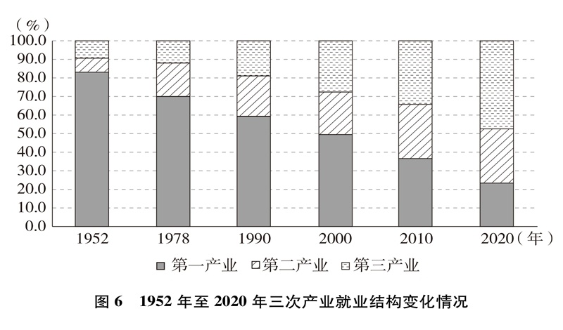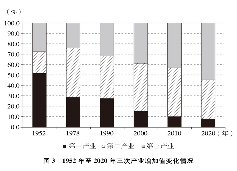 產(chǎn)業(yè)結(jié)構(gòu)優(yōu)化升級。中國已建成世界上最完整的產(chǎn)業(yè)體系,產(chǎn)業(yè)發(fā)展持續(xù)向中高端邁進。三次產(chǎn)業(yè)增加值之比從1952年的50.5∶20.8∶28.7到2020年的7.7∶37.8∶54.5,中國從傳統(tǒng)農(nóng)業(yè)大國成為工業(yè)大國、服務(wù)業(yè)大國(圖3),中國經(jīng)濟從依賴單一產(chǎn)業(yè)為主轉(zhuǎn)向依靠三次產(chǎn)業(yè)共同帶動。農(nóng)業(yè)現(xiàn)代化成效顯著,機械化、數(shù)字化、綠色化、功能化、共享化水平明顯提高,廣大農(nóng)民逐步告別“面朝黃土背朝天、一身力氣百身汗”的辛勞,農(nóng)村生產(chǎn)力極大解放;糧食生產(chǎn)能力穩(wěn)步提升,實現(xiàn)谷物基本自給,中國人把飯碗牢牢端在自己手中。中國建成門類齊全、獨立完整的現(xiàn)代工業(yè)體系,工業(yè)化和信息化融合發(fā)展的廣度和深度不斷拓展,“中國制造”向“中國智造”轉(zhuǎn)型升級,產(chǎn)業(yè)鏈供應(yīng)鏈現(xiàn)代化水平進一步提升。以新一代信息技術(shù)、生物技術(shù)、高端裝備、綠色環(huán)保為代表的戰(zhàn)略性新興產(chǎn)業(yè)發(fā)展迅速,成為引領(lǐng)高質(zhì)量發(fā)展的重要引擎。數(shù)字經(jīng)濟激發(fā)經(jīng)濟發(fā)展新活力,產(chǎn)業(yè)數(shù)字化和數(shù)字產(chǎn)業(yè)化趨勢加快?,F(xiàn)代服務(wù)業(yè)加速發(fā)展,以“互聯(lián)網(wǎng)+”為標志的新業(yè)態(tài)、新模式層出不窮,平臺經(jīng)濟、共享經(jīng)濟蓬勃興起,生產(chǎn)性服務(wù)業(yè)向?qū)I(yè)化和高端化發(fā)展,生活性服務(wù)業(yè)向精細化和高品質(zhì)轉(zhuǎn)變。產(chǎn)業(yè)結(jié)構(gòu)的優(yōu)化升級促進了經(jīng)濟更加均衡、更加充分的發(fā)展,人們個性化品質(zhì)化多樣化需求不斷得到滿足。
