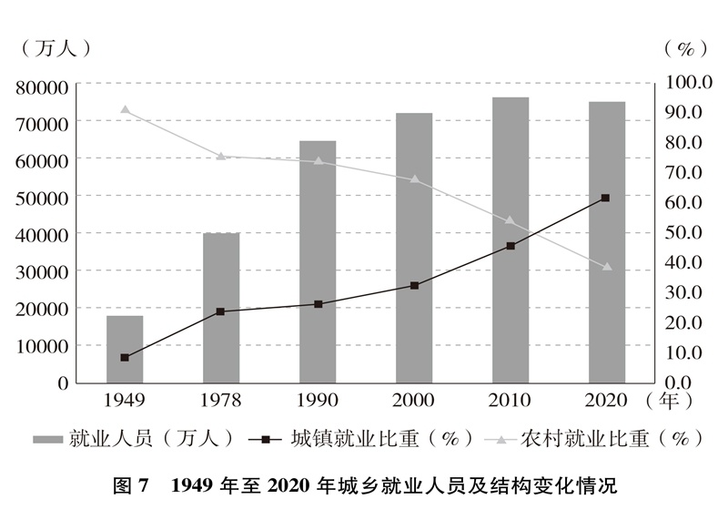 就業(yè)局勢長期穩(wěn)定,就業(yè)質(zhì)量顯著提升。就業(yè)人數(shù)從1949年的1.8億增加到2020年的7.5億,就業(yè)規(guī)模不斷擴大;從絕大多數(shù)勞動者以農(nóng)業(yè)為生到第三產(chǎn)業(yè)就業(yè)人數(shù)占47.7%(圖6)、城鎮(zhèn)就業(yè)人數(shù)占61.6%(圖7),就業(yè)結(jié)構(gòu)不斷優(yōu)化;從勞動者普遍處于文盲半文盲狀態(tài)到勞動年齡人口平均受教育年限10.8年、技能人才總量約2億,就業(yè)人員素質(zhì)大幅提高。億萬勞動者擁有自己熱愛的工作,開啟幸福生活的大門。從計劃分配到市場就業(yè)、自由擇業(yè)、自主創(chuàng)業(yè),從傳統(tǒng)就業(yè)方式到新就業(yè)形態(tài),勞動者的就業(yè)觀念深刻變革、就業(yè)空間更加廣闊、就業(yè)方式日益多元。人們的興趣愛好、特長稟賦與個人就業(yè)意愿、社會需求、國家需要更好結(jié)合,自我價值更好實現(xiàn),主動性創(chuàng)造性顯著增強,創(chuàng)新創(chuàng)造熱情不斷迸發(fā)。勞動者合法權(quán)益得到保障,勞動報酬保持增長,勞動所得受到保護,人們越來越有尊嚴地勞動、快樂地勞動,依靠自己的雙手創(chuàng)造美好生活。從“單休制”到“雙休制”,從“黃金周”到帶薪年休假,勞動者休息休假權(quán)益越來越有保障,工作生活更加平衡。勞動最光榮、最崇高、最偉大、最美麗日益成為全社會的共識和行動,勤奮做事、勤勉為人、勤勞致富成為風尚,崇尚勞動、尊重勞動、熱愛勞動的社會氛圍更加濃厚。