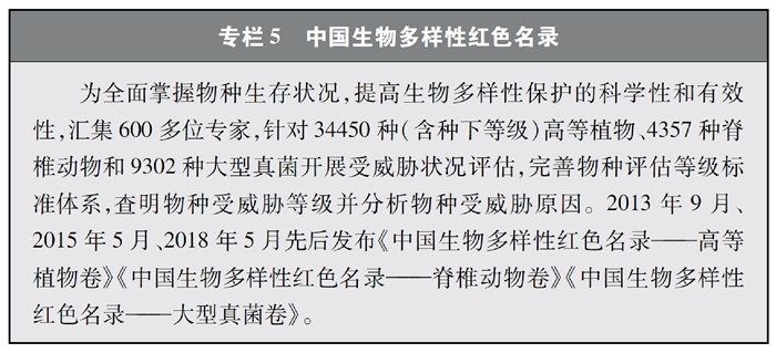 開展全國生物多樣性調(diào)查與評(píng)估。大力推進(jìn)生物多樣性保護(hù)重大工程實(shí)施,結(jié)合自然資源調(diào)查、生態(tài)系統(tǒng)監(jiān)測評(píng)估等工作,不斷完善生物多樣性調(diào)查與評(píng)估能力,首次將生物多樣性指標(biāo)納入生態(tài)質(zhì)量綜合評(píng)價(jià)指標(biāo)體系,引導(dǎo)地方加強(qiáng)生態(tài)文明建設(shè)與生物多樣性保護(hù)。開展自然資源調(diào)查,包括森林、草原、水、濕地、荒漠、海洋等,建立自然資源調(diào)查評(píng)價(jià)監(jiān)測制度。構(gòu)建了涵蓋2376個(gè)縣級(jí)行政單元、樣線總長超過3.4萬公里的物種分布數(shù)據(jù)庫,建立物種資源調(diào)查及收集信息平臺(tái),準(zhǔn)確反映野生動(dòng)植物空間分布狀況。完成長江經(jīng)濟(jì)帶、京津冀等國家戰(zhàn)略區(qū)域180多個(gè)縣級(jí)行政區(qū)生物多樣性調(diào)查與評(píng)估。組織開展近海漁業(yè)資源調(diào)查,初步掌握近海漁業(yè)資源狀況。陸續(xù)發(fā)布《中國植物紅皮書》《中國瀕危動(dòng)物紅皮書》《中國物種紅色名錄》《中國生物多樣性紅色名錄》,基本掌握生物多樣性總體情況,為加強(qiáng)生物多樣性保護(hù)奠定了科學(xué)基礎(chǔ)。