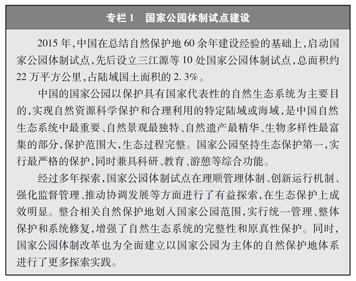 中國不斷推進(jìn)自然保護(hù)地建設(shè),啟動(dòng)國家公園體制試點(diǎn),構(gòu)建以國家公園為主體的自然保護(hù)地體系,率先在國際上提出和實(shí)施生態(tài)保護(hù)紅線制度,明確了生物多樣性保護(hù)優(yōu)先區(qū)域,保護(hù)了重要自然生態(tài)系統(tǒng)和生物資源,在維護(hù)重要物種棲息地方面發(fā)揮了積極作用。