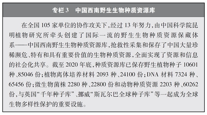 加快重要生物遺傳資源收集保存和利用。中國高度重視生物資源保護(hù),近年來在生物資源調(diào)查、收集、保存等方面取得較大進(jìn)展。實(shí)施戰(zhàn)略生物資源計(jì)劃專項(xiàng),完善生物資源收集收藏平臺(tái),建立種質(zhì)資源創(chuàng)新平臺(tái)、遺傳資源衍生庫和天然化合物轉(zhuǎn)化平臺(tái),持續(xù)加強(qiáng)野生生物資源保護(hù)和利用。實(shí)施一批種質(zhì)資源保護(hù)和育種創(chuàng)新項(xiàng)目,截至2020年底,形成了以國家作物種質(zhì)長期庫及其復(fù)份庫為核心、10座中期庫與43個(gè)種質(zhì)圃為支撐的國家作物種質(zhì)資源保護(hù)體系,建立了199個(gè)國家級(jí)畜禽遺傳資源保種場(區(qū)、庫),為90%以上的國家級(jí)畜禽遺傳資源保護(hù)名錄品種建立了國家級(jí)保種單位,長期保存作物種質(zhì)資源52萬余份、畜禽遺傳資源96萬份。建設(shè)99個(gè)國家級(jí)林木種質(zhì)資源保存庫,以及新疆、山東2個(gè)國家級(jí)林草種質(zhì)資源設(shè)施保存庫國家分庫,保存林木種質(zhì)資源4.7萬份。建設(shè)31個(gè)藥用植物種質(zhì)資源保存圃和2個(gè)種質(zhì)資源庫,保存種子種苗1.2萬多份。