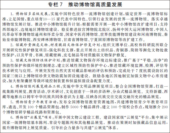實施中國特色世界一流博物館創(chuàng)建計劃。支持省級、重要地市級博物館特色化發(fā)展。盤活基層博物館資源。探索建立行業(yè)博物館聯(lián)合認證、共建共管機制。規(guī)范和扶持非國有博物館發(fā)展,落實支持政策,依法依規(guī)推進非國有博物館法人財產(chǎn)權確權。認真履行相關審批程序,有序推動建設一批反映黨和國家建設成就的當代主題博物館和行業(yè)博物館,重點支持建設反映中華文明發(fā)展歷程的國家級重點專題博物館,倡導建設特色專題博物館。探索在文化資源豐厚地區(qū)建設“博物館之城”。