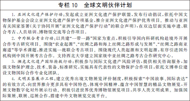 編制并實施“十四五”考古工作專項規(guī)劃。系統(tǒng)確定考古發(fā)掘重點,深化中華文明探源工程,推進“考古中國”重大項目,科學闡釋中國境內(nèi)人類起源、文明起源、中華文明形成、統(tǒng)一多民族國家建立和發(fā)展、中華文明在世界文明史中的重要地位等關鍵問題,揭示中華文明的歷史文化價值和核心特質(zhì)。