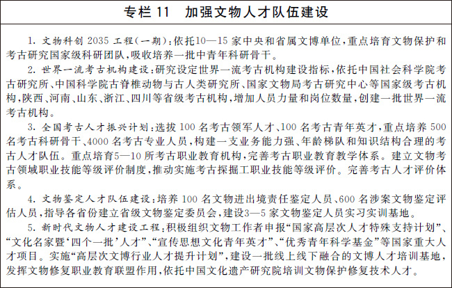 培育一批以領軍人才和中青年骨干創(chuàng)新人才為重點的高層次文物人才,加強考古、科技創(chuàng)新、文物鑒定、文物修復、文物展覽等急需領域人才培養(yǎng),加快建設一支門類齊全、技藝精湛的文物技能人才隊伍,穩(wěn)步造就一支科技研發(fā)能力和技術應用能力過硬的文物科技人才隊伍,錘煉一支熟悉專業(yè)、素質(zhì)優(yōu)良的文物管理人才隊伍。加強相關行業(yè)文物保護人才培養(yǎng)。