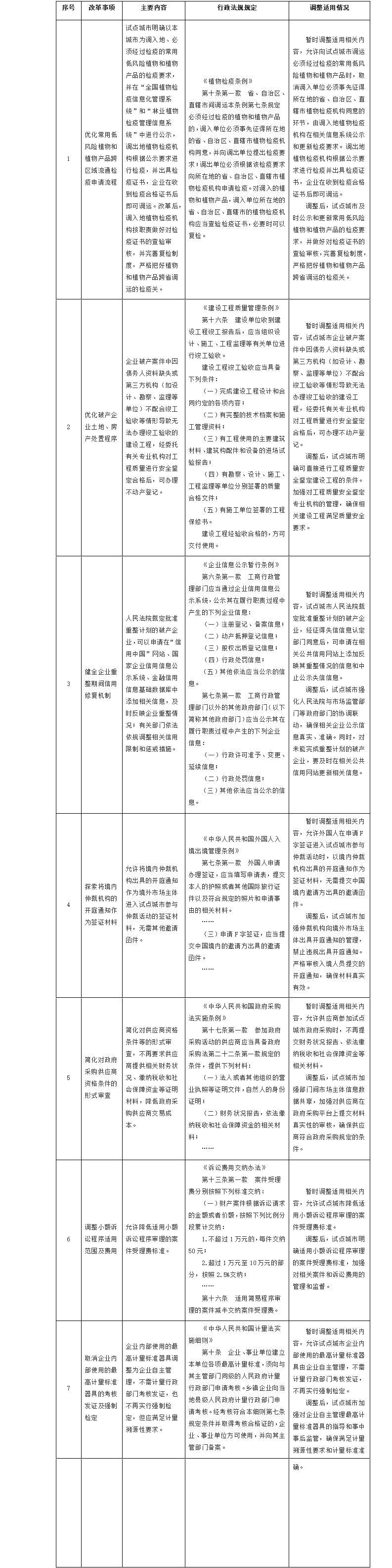 (十五)強化法治保障。按照重大改革于法有據(jù)的要求,依照法定程序開展營商環(huán)境創(chuàng)新試點工作。國務院決定,根據(jù)《全國人民代表大會常務委員會關于授權國務院在營商環(huán)境創(chuàng)新試點城市暫時調整適用〈中華人民共和國計量法〉有關規(guī)定的決定》,3年內(nèi)在營商環(huán)境創(chuàng)新試點城市暫時調整適用《中華人民共和國計量法》有關規(guī)定;同時,在營商環(huán)境創(chuàng)新試點城市暫時調整適用《植物檢疫條例》等7部行政法規(guī)有關規(guī)定。國務院有關部門和有關地方人民政府要根據(jù)法律、行政法規(guī)的調整情況,及時對本部門和本地區(qū)制定的規(guī)章、規(guī)范性文件作相應調整,建立與試點要求相適應的管理制度。對試點成效明顯的改革舉措,要及時推動有關法律、法規(guī)、規(guī)章的立改廢釋,固化改革成果。