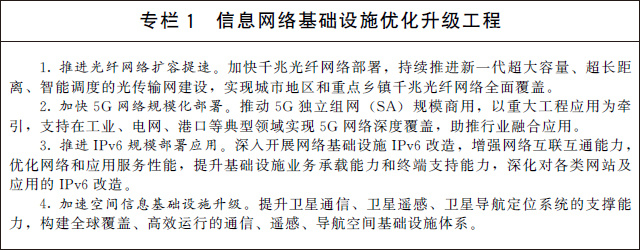 (一)加快建設(shè)信息網(wǎng)絡(luò)基礎(chǔ)設(shè)施。建設(shè)高速泛在、天地一體、云網(wǎng)融合、智能敏捷、綠色低碳、安全可控的智能化綜合性數(shù)字信息基礎(chǔ)設(shè)施。有序推進(jìn)骨干網(wǎng)擴容,協(xié)同推進(jìn)千兆光纖網(wǎng)絡(luò)和5G網(wǎng)絡(luò)基礎(chǔ)設(shè)施建設(shè),推動5G商用部署和規(guī)模應(yīng)用,前瞻布局第六代移動通信(6G)網(wǎng)絡(luò)技術(shù)儲備,加大6G技術(shù)研發(fā)支持力度,積極參與推動6G國際標(biāo)準(zhǔn)化工作。積極穩(wěn)妥推進(jìn)空間信息基礎(chǔ)設(shè)施演進(jìn)升級,加快布局衛(wèi)星通信網(wǎng)絡(luò)等,推動衛(wèi)星互聯(lián)網(wǎng)建設(shè)。提高物聯(lián)網(wǎng)在工業(yè)制造、農(nóng)業(yè)生產(chǎn)、公共服務(wù)、應(yīng)急管理等領(lǐng)域的覆蓋水平,增強固移融合、寬窄結(jié)合的物聯(lián)接入能力。