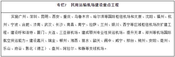 擴(kuò)大航空網(wǎng)絡(luò)覆蓋。推動區(qū)域機場群協(xié)同發(fā)展,建設(shè)京津冀、長三角、粵港澳大灣區(qū)、成渝等世界級機場群。適時啟動能力緊張樞紐機場改擴(kuò)建工程,強化樞紐機場綜合保障能力。合理加密機場布局,穩(wěn)步建設(shè)支線機場和專業(yè)性貨運樞紐機場,提升綜合性機場貨運能力和利用率。有序推進(jìn)通用機場規(guī)劃建設(shè),構(gòu)建區(qū)域短途運輸網(wǎng)絡(luò),探索通用航空與低空旅游、應(yīng)急救援、醫(yī)療救護(hù)、警務(wù)航空等融合發(fā)展。優(yōu)化航路航線網(wǎng)絡(luò),加強軍民航空管基礎(chǔ)設(shè)施建設(shè),推廣應(yīng)用空管新技術(shù)。
