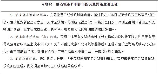 強化重點城市群城際交通建設(shè)。圍繞京津冀、長三角、粵港澳大灣區(qū)、成渝、長江中游等城市群,以軌道交通、高速公路為骨干,提升城際運輸通道功能,加強核心城市快速直連,構(gòu)建多節(jié)點、網(wǎng)絡(luò)化的城際交通網(wǎng),實現(xiàn)城市群內(nèi)主要城市間2小時通達(dá)。整體推進(jìn)京津冀、長三角、粵港澳大灣區(qū)城際鐵路和市域(郊)鐵路建設(shè),有序推動成渝地區(qū)雙城經(jīng)濟(jì)圈城際鐵路和市域(郊)鐵路建設(shè),加強與高速鐵路、普速鐵路一體銜接,擴(kuò)大對5萬人口以上城鎮(zhèn)的有效覆蓋。