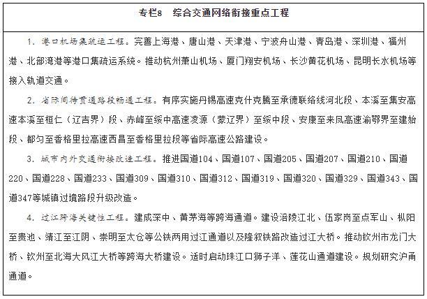 建設(shè)多節(jié)點、網(wǎng)格狀、全覆蓋的京津冀一體化綜合交通網(wǎng)絡(luò),基本建成軌道上的京津冀,高標(biāo)準(zhǔn)、高質(zhì)量打造雄安新區(qū)對外交通網(wǎng)絡(luò),加強北京城市副中心與中心城區(qū)、廊坊北三縣交通基礎(chǔ)設(shè)施互聯(lián)互通,強化北京冬奧會、冬殘奧會交通保障。依托長江黃金水道,整體設(shè)計推進(jìn)長江經(jīng)濟(jì)帶綜合交通運輸體系建設(shè),補強沿江高鐵和鐵路貨運能力,全力打通公路省際待貫通路段,提升江海聯(lián)運、鐵水聯(lián)運發(fā)展水平。推進(jìn)粵港澳大灣區(qū)基礎(chǔ)設(shè)施互聯(lián)互通,優(yōu)化航運和航空資源配置,加強港澳與內(nèi)地的交通聯(lián)系,支持香港提升國際航運、國際航空樞紐地位。推動長三角地區(qū)交通運輸更高質(zhì)量一體化發(fā)展,加快對外交通、城際交通、都市圈交通高效銜接和有機融合,協(xié)同推進(jìn)港航、海事一體化發(fā)展,推動上海市、江蘇省、浙江省、安徽省共建輻射全球的航運樞紐,加快提升江蘇通州灣江海聯(lián)動示范區(qū)功能,打造長江集裝箱運輸新出海口。構(gòu)建海南島內(nèi)暢通、陸島連通、全球通達(dá)的現(xiàn)代綜合交通運輸體系,建設(shè)現(xiàn)代化綜合交通樞紐,穩(wěn)步推進(jìn)自由貿(mào)易港建設(shè)。構(gòu)建黃河流域綠色安全便捷綜合交通網(wǎng)絡(luò),強化跨區(qū)域大通道建設(shè)。
