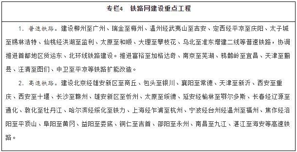 建設(shè)現(xiàn)代化鐵路網(wǎng)。堅持客貨并重、新建改建并舉、高速普速協(xié)調(diào)發(fā)展,加快普速鐵路建設(shè)和既有鐵路擴(kuò)能改造,著力消除干線瓶頸,推進(jìn)既有鐵路運能緊張路段能力補強,加快提高中西部地區(qū)鐵路網(wǎng)覆蓋水平。加強資源富集區(qū)、人口相對密集脫貧地區(qū)的開發(fā)性鐵路和支線鐵路建設(shè)。推進(jìn)高速鐵路主通道建設(shè),提升沿江、沿海、呼南、京昆等重要通道以及京滬高鐵輔助通道運輸能力,有序建設(shè)區(qū)域連接線。綜合運用新技術(shù)手段,改革創(chuàng)新經(jīng)營管理模式,提高鐵路網(wǎng)整體運營效率。統(tǒng)籌考慮運輸需求和效益,合理規(guī)劃建設(shè)鐵路項目,嚴(yán)控高速鐵路平行線路建設(shè)。