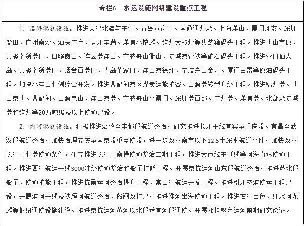 優(yōu)化暢通水運設(shè)施網(wǎng)絡(luò)。建設(shè)京津冀、長三角、粵港澳大灣區(qū)世界級港口群,支持山東打造世界一流的海洋港口,推進(jìn)東北地區(qū)沿海港口一體化發(fā)展,優(yōu)化港口功能布局,推動資源整合和共享共用。有序推進(jìn)沿海港口專業(yè)化碼頭及進(jìn)出港航道等公共設(shè)施建設(shè)。適度超前建設(shè)糧食、能源、礦產(chǎn)資源的接卸、儲存、中轉(zhuǎn)設(shè)施,推進(jìn)沿海沿江液化天然氣碼頭規(guī)劃建設(shè)。提升內(nèi)河港口專業(yè)化、規(guī)?;?,合理集中布局集裝箱、煤炭、鐵礦石、商品汽車等專業(yè)化碼頭。加強內(nèi)河高等級航道擴(kuò)能升級與暢通攻堅建設(shè),完善長江、珠江、京杭運河和淮河等水系內(nèi)河高等級航道網(wǎng)絡(luò),進(jìn)一步提升珠三角高等級航道網(wǎng)出海能力,全面加強長三角、珠江—西江高等級航道網(wǎng)未達(dá)標(biāo)段建設(shè)。推動重要支流航道和庫湖區(qū)航道、內(nèi)河旅游航道、便民碼頭建設(shè)。