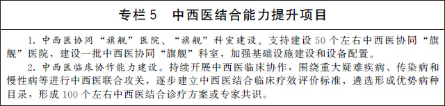推動(dòng)綜合醫(yī)院中西醫(yī)協(xié)同發(fā)展。在綜合醫(yī)院推廣“有機(jī)制、有團(tuán)隊(duì)、有措施、有成效”的中西醫(yī)結(jié)合醫(yī)療模式,將中醫(yī)納入多學(xué)科會(huì)診體系,加強(qiáng)中西醫(yī)協(xié)作和協(xié)同攻關(guān),制定實(shí)施“宜中則中、宜西則西”的中西醫(yī)結(jié)合診療方案。將中西醫(yī)協(xié)同發(fā)展工作納入醫(yī)院評(píng)審和公立醫(yī)院績(jī)效考核。推動(dòng)三級(jí)綜合醫(yī)院全部設(shè)置中醫(yī)臨床科室,設(shè)立中醫(yī)門診和中醫(yī)病床。打造一批中西醫(yī)協(xié)同“旗艦”醫(yī)院、“旗艦”科室,開(kāi)展重大疑難疾病、傳染病、慢性病等中西醫(yī)聯(lián)合攻關(guān)。
