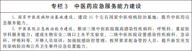 加強(qiáng)中醫(yī)藥應(yīng)急救治能力建設(shè)。依托高水平三級(jí)甲等中醫(yī)醫(yī)院,建設(shè)覆蓋所有省份的國(guó)家中醫(yī)疫病防治基地,依托基地組建中醫(yī)疫病防治隊(duì)伍,提升中醫(yī)緊急醫(yī)學(xué)救援能力。三級(jí)公立中醫(yī)醫(yī)院和中西醫(yī)結(jié)合醫(yī)院(不含中醫(yī)專科醫(yī)院)全部設(shè)置發(fā)熱門診,加強(qiáng)感染性疾病、急診、重癥、呼吸、檢驗(yàn)等相關(guān)科室建設(shè),提升服務(wù)能力。
