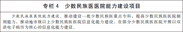 3.發(fā)展少數(shù)民族醫(yī)藥。加強(qiáng)少數(shù)民族醫(yī)醫(yī)療機(jī)構(gòu)建設(shè),提高民族地區(qū)基層醫(yī)療衛(wèi)生機(jī)構(gòu)少數(shù)民族醫(yī)藥服務(wù)能力。改善少數(shù)民族醫(yī)醫(yī)院基礎(chǔ)設(shè)施條件,加強(qiáng)少數(shù)民族醫(yī)醫(yī)院??颇芰?、制劑能力和信息化能力建設(shè)。建立符合少數(shù)民族醫(yī)醫(yī)療機(jī)構(gòu)自身特點(diǎn)和發(fā)展規(guī)律的績(jī)效評(píng)價(jià)指標(biāo)體系。加大少數(shù)民族醫(yī)藥防治重大疾病和優(yōu)勢(shì)病種研究力度,有效傳承特色診療技術(shù)和方法。鼓勵(lì)和扶持少數(shù)民族醫(yī)藥院校教育、師承教育和繼續(xù)教育。加大對(duì)少數(shù)民族醫(yī)藥的傳承保護(hù)力度,持續(xù)開(kāi)展少數(shù)民族醫(yī)藥文獻(xiàn)搶救整理工作,推動(dòng)理論創(chuàng)新和技術(shù)創(chuàng)新。